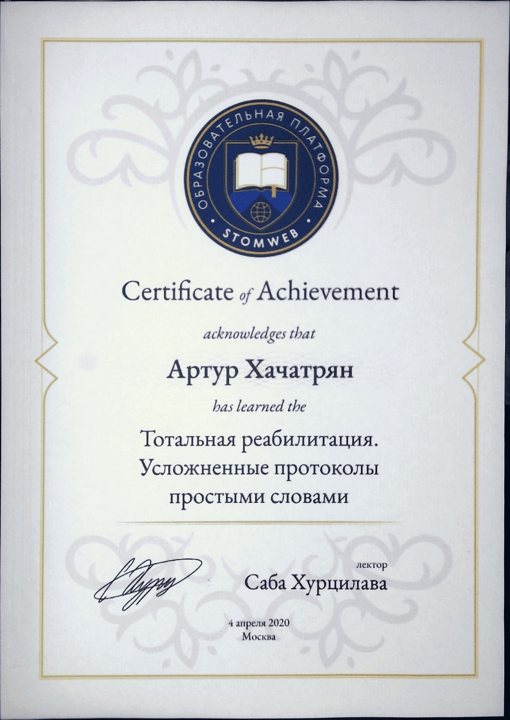 Регулярно повышает квалификацию. Особое внимание уделяет вопросам тотальной реабилитации на дентальных имплантатах.